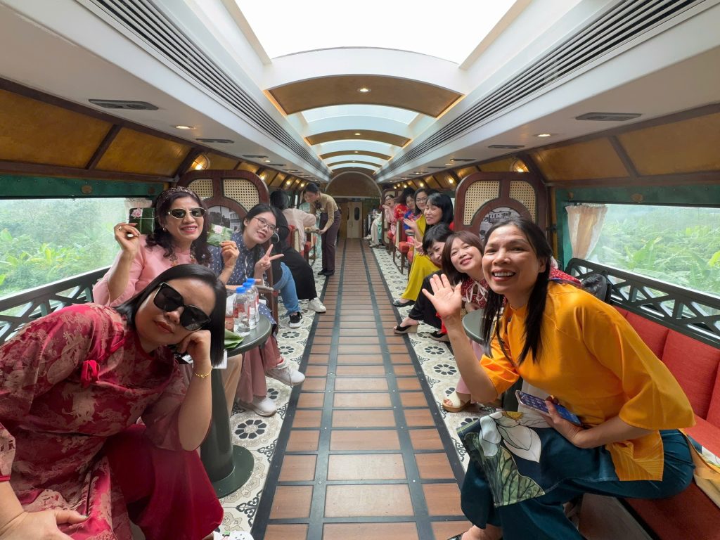 Tàu du lịch 5 Cửa Ô mang đến không gian rộng mở, thoáng đãng, giúp các thành viên có những phút giây thư giãn giữa cảnh sắc sông nước. Từ boong tàu, khung cảnh hữu tình kết hợp với sắc áo dài truyền thống đã tạo nên những khoảnh khắc đẹp, trang trọng và đầy tự hào về nét đẹp văn hóa Việt.
